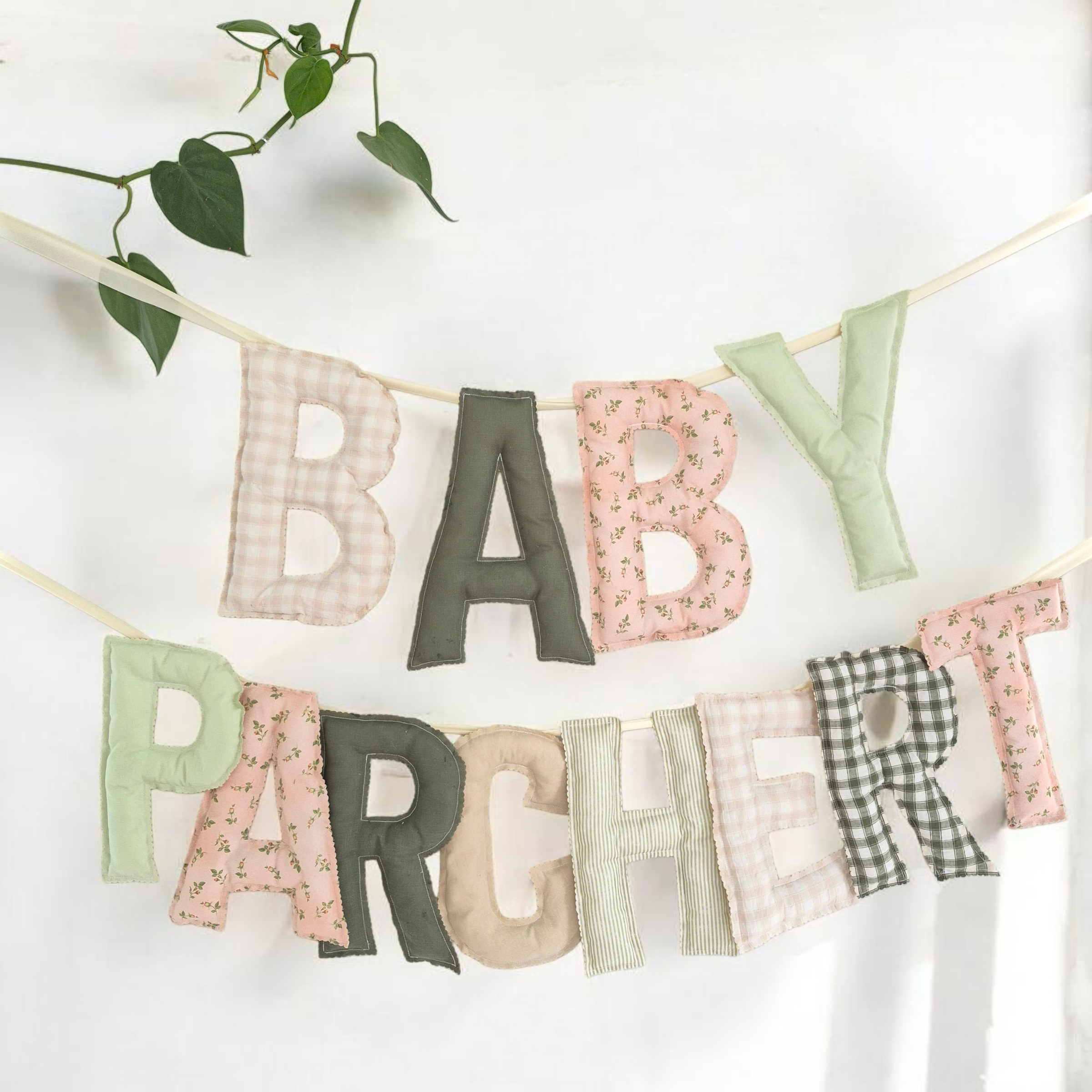 This XL custom-made bunting is perfect for adding a cute personal touch to any special occasion or room. Handmade with love from my little home office in Brisbane using high quality fabrics. Customisable with your chosen name, phrase, or special date, it's a unique addition to weddings, birthdays, baby showers, photoshoots, or bedrooms.